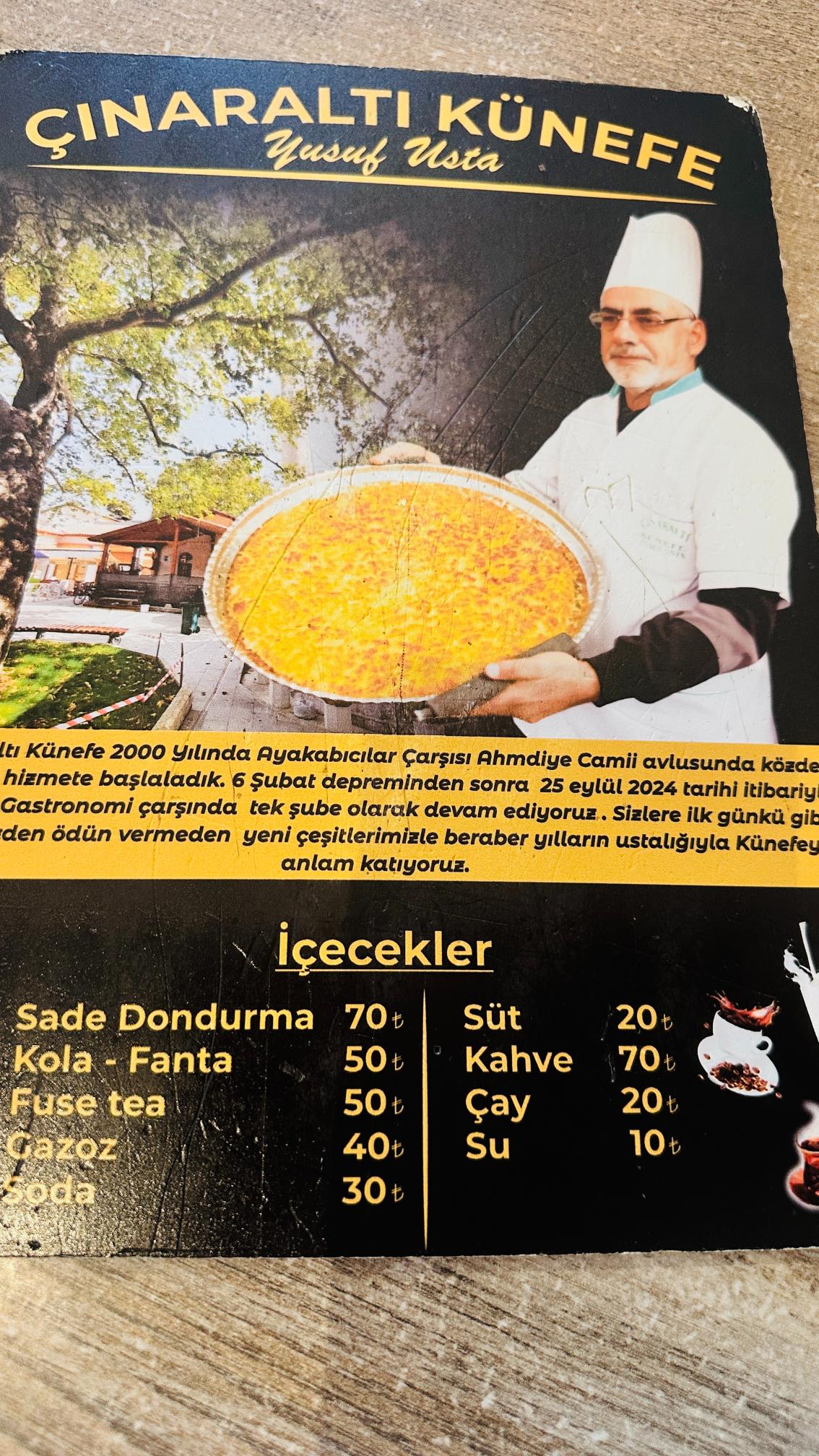 Köz ateşinde, koca koca tepsilerde pişirilen künefeler, gün boyu dolup taşan konuklar tarafından anında tüketiliyor. Ülkemizin en lezzetli künefelerini hazırlayan işletme, Yusuf Ustanın emeğiyle misafirlere ikram ediliyor.
